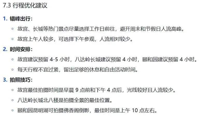 不過,和之前相同,部分景點(diǎn)的時(shí)間安排仍然存在bug,例如信息中明確提及頤和園的建議游玩時(shí)間為3小時(shí),但行程中只安排了2小時(shí),而此后的圓明園游覽更是只安排了20分鐘,令人疑惑。