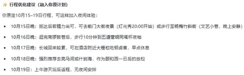 這次Qwen則推薦了什剎海、亮馬河國際風(fēng)情水岸等去處,以及去天橋和國家大劇院看演出、去簋街吃夜宵和夜騎胡同等娛樂方式。