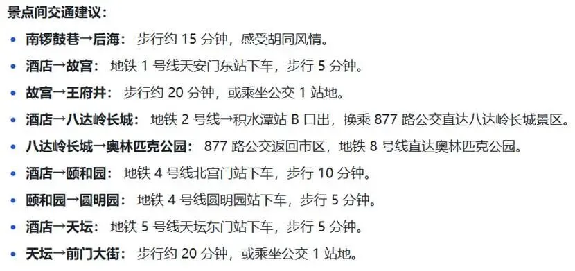 同樣是交通方面,豆包也展現(xiàn)出了一個(gè)亮點(diǎn),它清晰的列出了用戶抵達(dá)北京后從酒店到景點(diǎn)以及景點(diǎn)之間的交通方式: