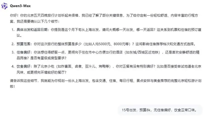 但由于預(yù)設(shè)的提示詞比較隨意,Qwen注意到了這一點(diǎn),并提出了更加細(xì)致的詢問: