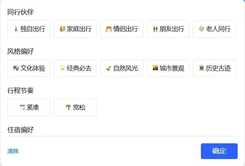 作為專業(yè)選手,攜程AI的界面更加直觀,除了出發(fā)地、目的地和日期外,還設(shè)置了旅行偏好的相關(guān)選項(xiàng)。