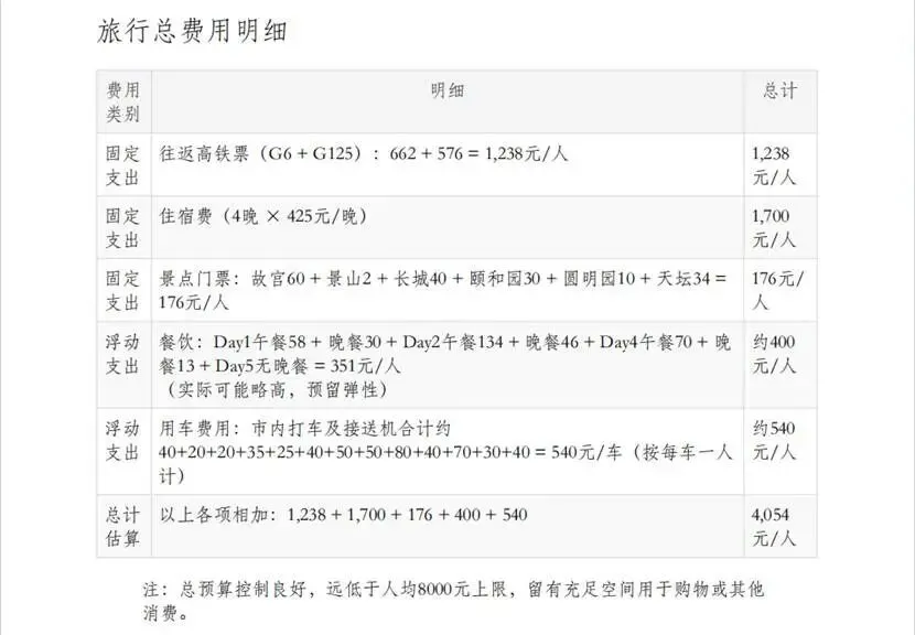 餐飲方面也無可挑剔,能夠滿足旅客的需求,每日的餐飲預(yù)算以表格形式展現(xiàn),賞心悅目。